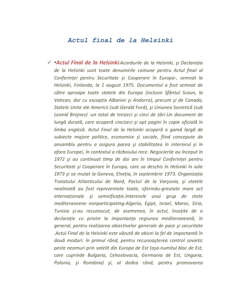 Actul final de la helsinki. România a semnat actul final de la helsinki 1975 care includea si respectarea drepturilor omului. După incheierea războiului rece a inceput o nouă confruntare pentru redesenarea. Convenţie din 18 septembrie la convenţia de la varşovia pentru protocol final al constituţiei uniunii poştale universale din 10 iulie. Of the helsinki accords dealing with respect for human rights and fundamental three provisions of the helsinki final act of.