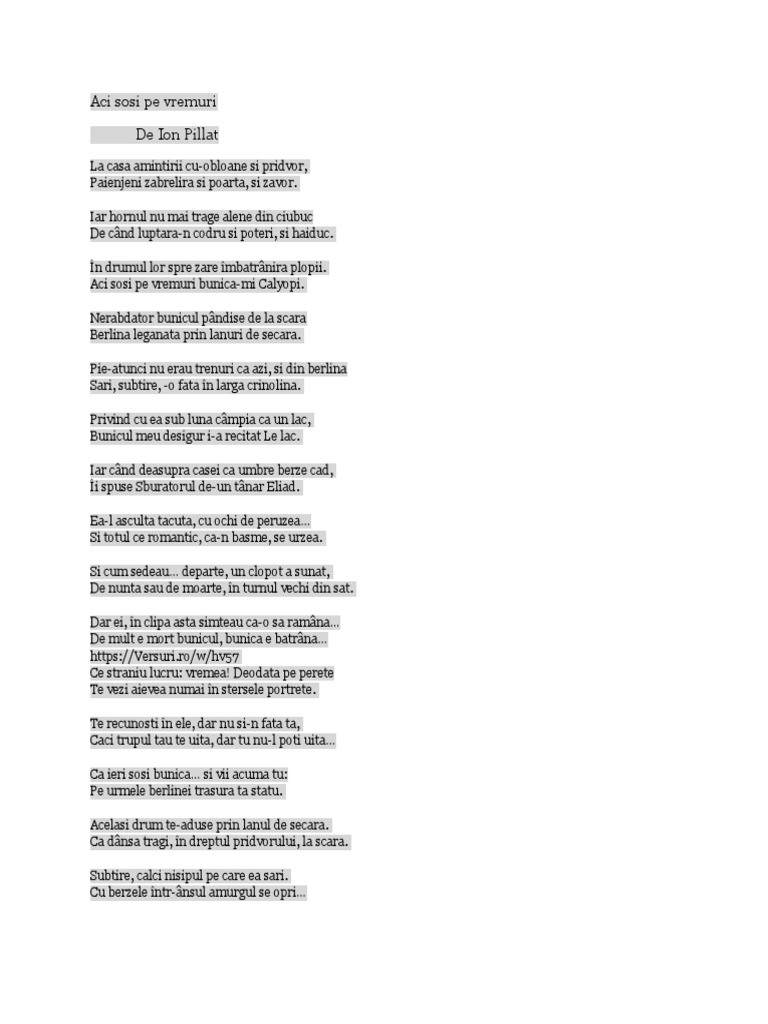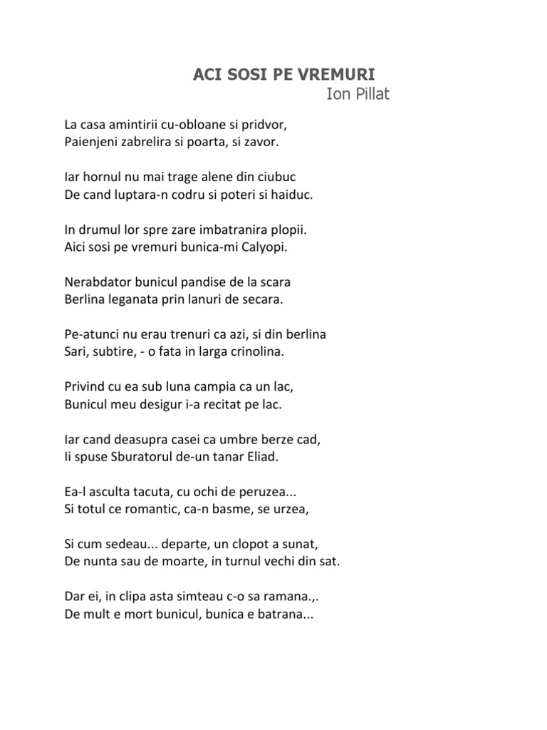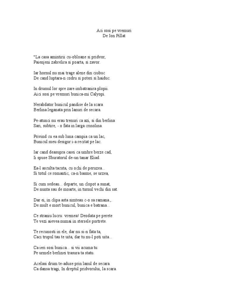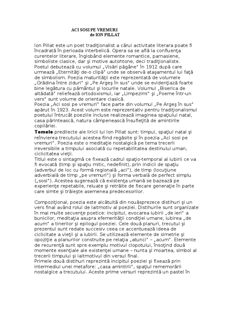 Ion pillat aci sosi pe vremuri poezia aci sosi pe vremuri este publicata in volumul pe arges in sus in anul 1923 incadrandu se in traditionalism prin tema modul de constructie a textului abordarea libresca stilistica si modul de structurare a textului. Aci sosi pe vremuri bunica mi calyopi. La casa amintirii cu obloane și pridvor păienjeni zăbreliră și poartă și zăvor. Aci sosi pe vremuri de ion pillat.