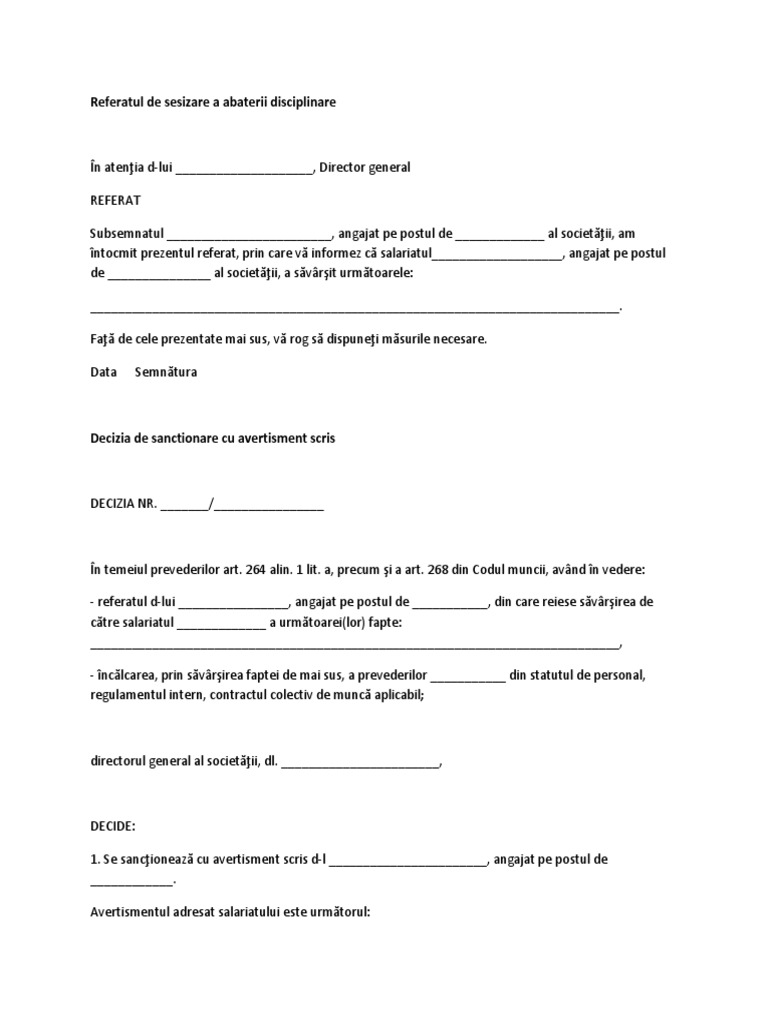 A precum si a art. Decizie sanctionare cu avertisment scris. Model decizie sanctionare disciplinara 2018 model avertisment scris sanctionare disciplinara 2018. Se face intai un referat de catre cel.