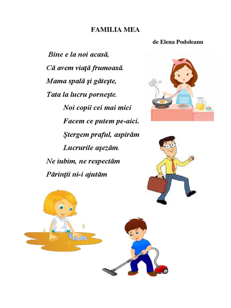 Casa mea și n somn o știu orice colț pot să l descriu. Nu e lume mai frumoasă cum e cuibul părintesc unde eu trăiesc și cresc. Tata mama și bunici eu și frățiorii mici toți aici suntem uniți bucuroși și fericiți. Când pășesc al casei prag tot ce vad în ea.