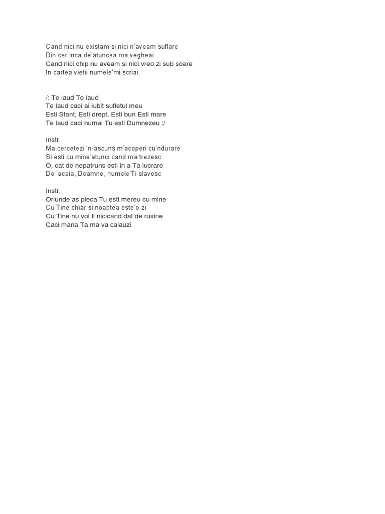 Te laud te laud te laud caci ai iubit sufletul meu esti sfant esti drept esti bun esti mare te laud caci numai tu esti dumnezeu instr. Când nici nu existam și nici n aveam suflare din cer încă de atuncea mă vegheai. Abonați vă canalului nostru de youtube pentru a primi primii cântările. Din cer încă de atuncea mă vegheai.