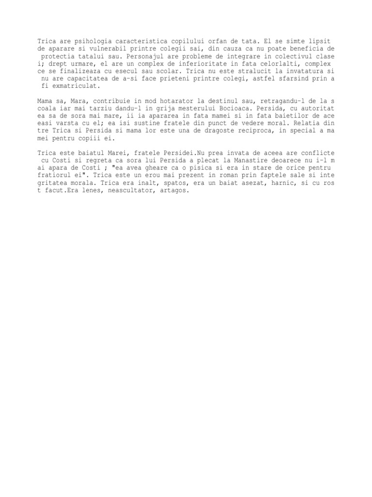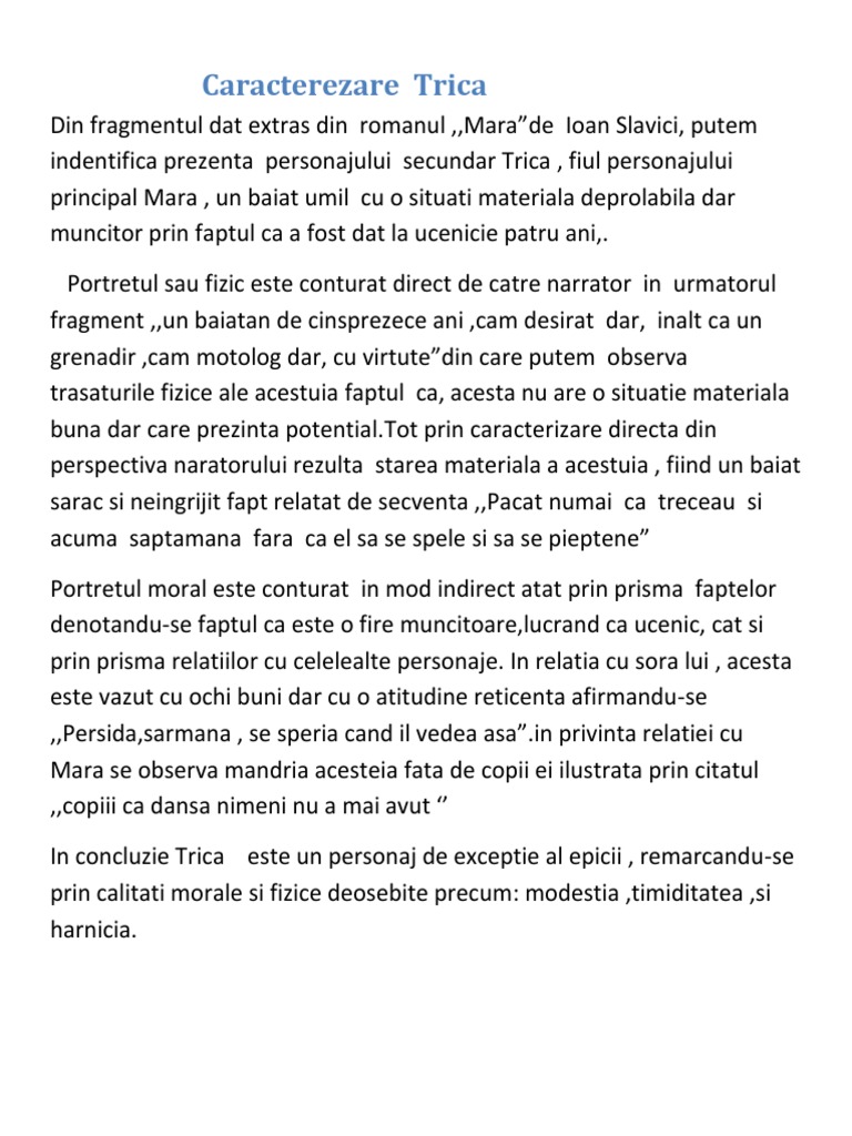 Caracterizarea lui trica. Hei tpu am nevoie de caracterizarea lui trica din mara de ioan slavici am incercat sa fac ceva dar nu prea mi a iesit va rog muuuult. Drept urmare el are un complex de inferioritate in fata celorlalti complex ce se finalizeaza cu esecul sau scolar. Ca bildungroman mara urmareste evolutia persidei si a lui trica persida e educate de calugaritele catolice din lipova avand o ca parinte spiritual scriam pe maica aegidia alegerea unei manastiri catolice ca loc de educatie pentru persida nu e intamplatoare ci contribuie la acutizarea tensiunii romanesti spatiul desavarsiri morale al. Trica are psihologia caracteristica copilului orfan de tata.