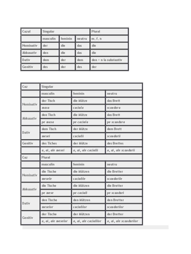 în limba română substantivul are cinci cazuri. învață limba germană online și gratuit. Lucrurile nu stau chiar așa. Articolul hotărât este o parte de vorbire care ajută la integrarea substantivului într un caz gen și număr articolul mai este numit in limba germană și nomenbegleiter din aceasta cauză este nevoie de un tabel cu susbtantive de genuri diferite fie la numărul singular sau plural care s ă evidențieze modificarea atât al articolului cât și al formei substantivului pentru.