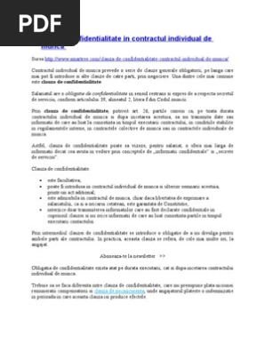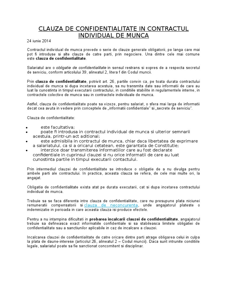 Tot mai mult se intalneste in practica inserarea in contracte a unei clauze de confidentialitate. Clauza de neconcurenta isi produce efectele numai daca in cuprinsul contractului individual de munca sunt prevazute in mod concret activitatile ce sunt interzise salariatului pe durata contractului. Obligaţia de confidenţialitate reglementată de art. Apasati butonul alaturat plateste prin sms si urmariti instructiunile privind procedura de plata folosind telefonul mobil.