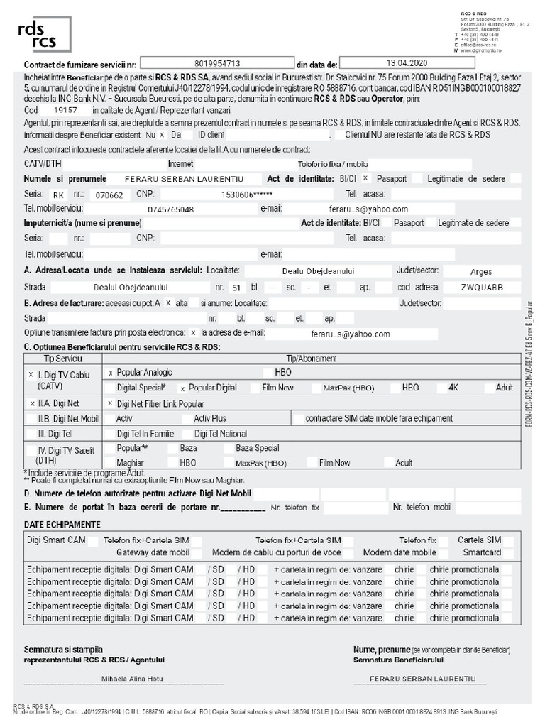 Contract rcs rds acte necesare. Le am scris un mail in care le solicitam motivul pentru care au anulat actul aditional deoarece in contract nu exista un articol care sa interzica transferul de titular de contract. Pentru incheierea unui nou contract sunt necesare pe langa bi ci si chitanta si factura pentru aparatul cumparat. Totodata daca aceasta taxa va fi achitata abonatul isi poate pastra numarul de telefon iar portarea lui nu mai depinde de operator. Instalarea echipamentelor digi tv poate fi realizata de catre firme autorizate care lucreaza in parteneriat cu rcs rds sau de catre echipele rcs rds care asigura si service ul executiei.