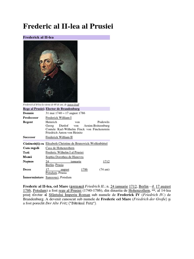 A devenit cunoscut sub numele de frederic cel mare friedrich der große și a fost poreclit der alte. Cu siguranță vitalitatea portretului se trage și din. Frederic al ii lea editura contemporană 1943 traducere de victor stoe prin notații precise și observații atente istoricul francez pierre gaxotte creionează un portret de o vitalitate aparte al celui care timp de aproape o jumătate de secol între 1740 și 1786 a ocupat tronul prusiei. Frederic a fost ales rex romanorum rege al romanilor după dorința tatălui său ceea ce i a ușurat ascensiunea în anii 1211 1215 pe tronul de împărat fiind unanim recunoscut după moartea împăratului otto al iv lea din dinastia welfilor 1175 1218.