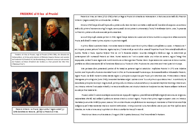 Frederic al ii lea cel mare germană friedrich ii. A fost fiul regelui christian al x lea al danemarcei și al reginei alexandrine născută ducesă de mecklenburg. La scurt timp după urcarea pe tron 1740 regele începe razboiul de succesiune la tronul austriei cu scopul de a reface economic prusia țară săracă în materii prime alipindu i o provincie bogată. Frederic al ii lea s a urcat pe tron la 28 de ani în 1740 regatul său fiind fragmentat în prusia orientală capitală koenigsberg azi kaliningrad enclava rusă de la baltica la est cu principatul brandenburg şi ducatele magdeburg şi pomerania capitala la berlin la centru şi comitatele lingen mark şi ravensburg la vest.
