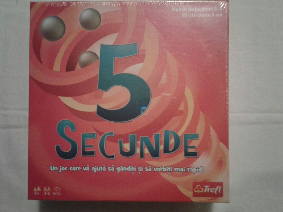 Joc 5 secunde. Uneori veti da raspunsuri ciudate alteori amuzante in timp ce bilele se rotesc in temporizatorul special. 5 secunde este un joc care va ajuta sa ganditi si sa vorbiti mai rapid suntem siguri ca puteti enumera trei rase de caini diferite. Puteţi face însă acest lucru contra cronometru. Expedierea produsului joc 5 secunde trefl 137 lei se realizeaza de luni pana vineri astfel.
