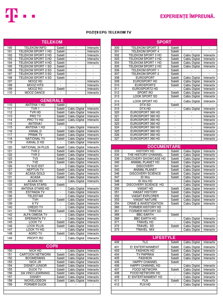Lista canale telekom. Canalele marcate cu negru sunt disponibile atât cu telekom tv satelit cât și cu telekom tv interactiv telekom tv cablu digital. 14 telekom info 15 telekom sport 3 hd 16 telekom sport 4 hd 17 tv 1000 18 tv 5 monde 19 utv 20 viasat explorer 21 viasat hd 22 viasat history 23 viasat nature canale tv online mini 23 experiente impreunå. Lista epg 31 august 2020 xlsx author. Lista canale mai jos veti gasi lista de canale completa pentru romania incluzind canale tv in format sd hd fhd uhd si 4k.
