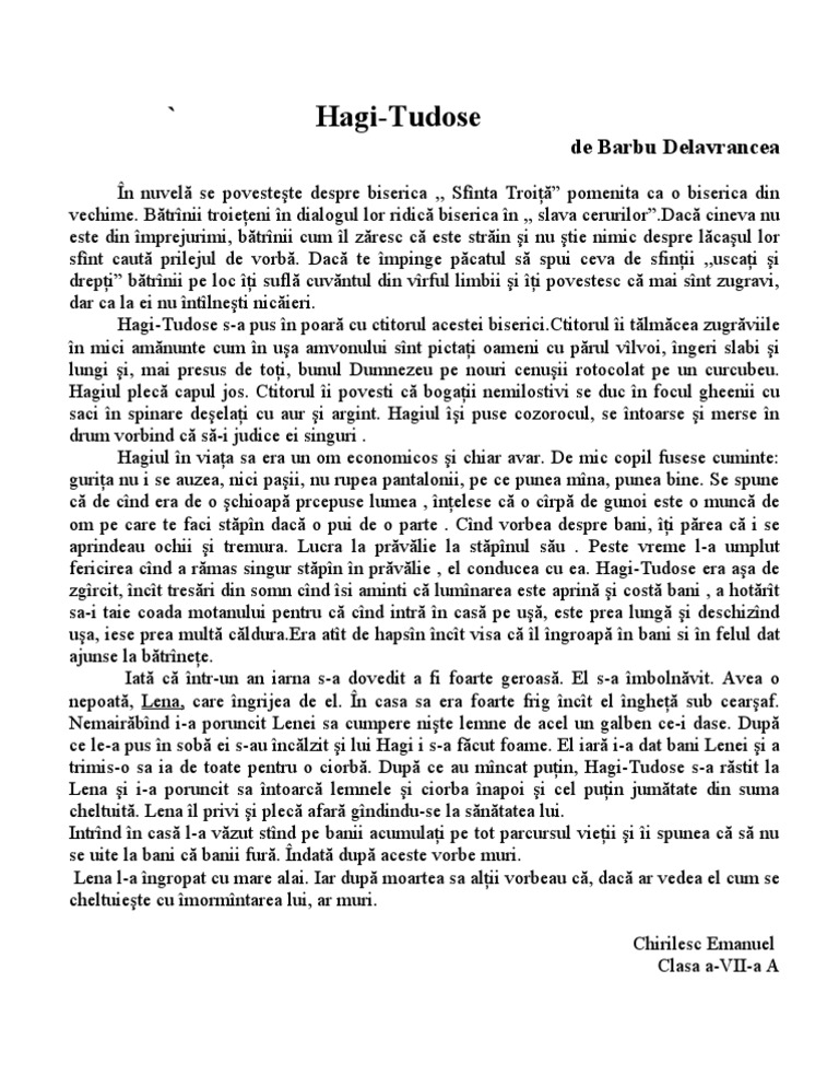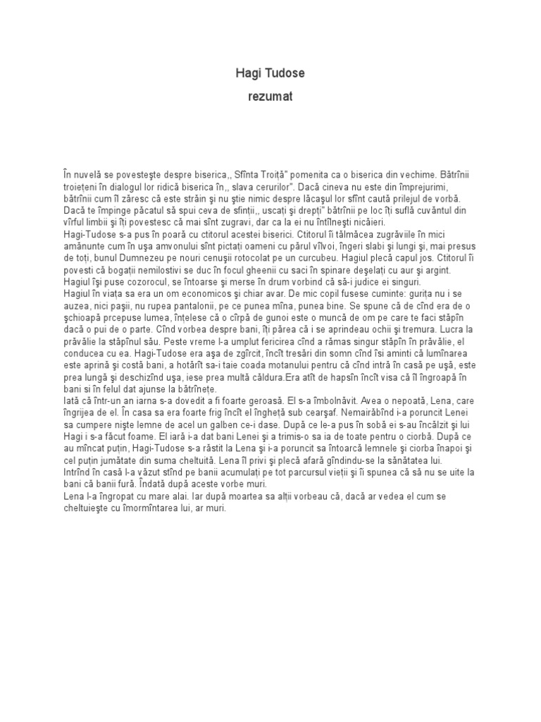 Rezumat hagi tudose. 1 vezi răspunsul bianca8567 bianca8567 naratorul prezinta in aceasta opera literara un om pe nume hagi tudose care traia langa biserica sfanta troita. Hagi tudose rezumat pe capitole i troițenii se mândresc din cale afară cu biserica lor sfânta troia numărând și lăudând fără încetare minunile săvârșite aici dar fiecare în felul său ceea ce duce adesea la ceartă. Autorul descrie personajul principal tudose hagiul ca un personaj zgarcit care iarna tremura de frig vara murea de cald de craciun nu cumpara nimic din produsele traditionale iar de pasti nu colora si nu cumpara miel. Rezumat de doua pagini si rezumat scurt de o jumatate de pagina al nuvelei hagi tudose publicata de autor in 1903 la editura socec.