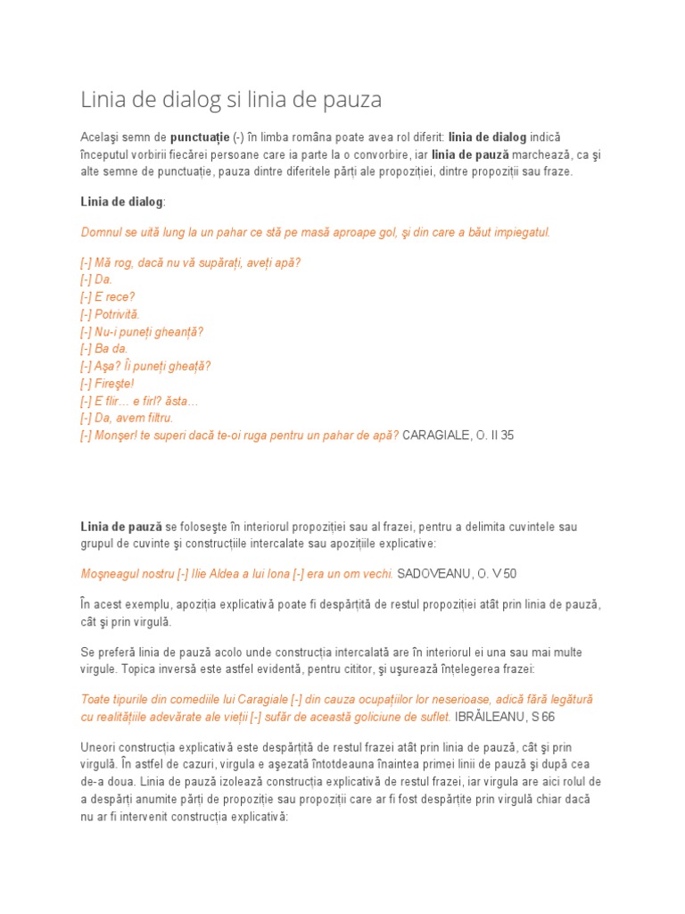 Cât a ţinut calea vro şase ore guriţa nu î a tăcut. 1 pentru a izola o construcție incidentă de restul enunțului eu sunt felix adaugă tânărul uimit de această primire nepotul dumnealui 2. Sergiu drincu semnele ortografice și de punctuație în limba română ed. De regulă linia de dialog se plasează la capăt de rând precedată de spațiul pentru marcarea alineatului și urmată de blanc spațiu.