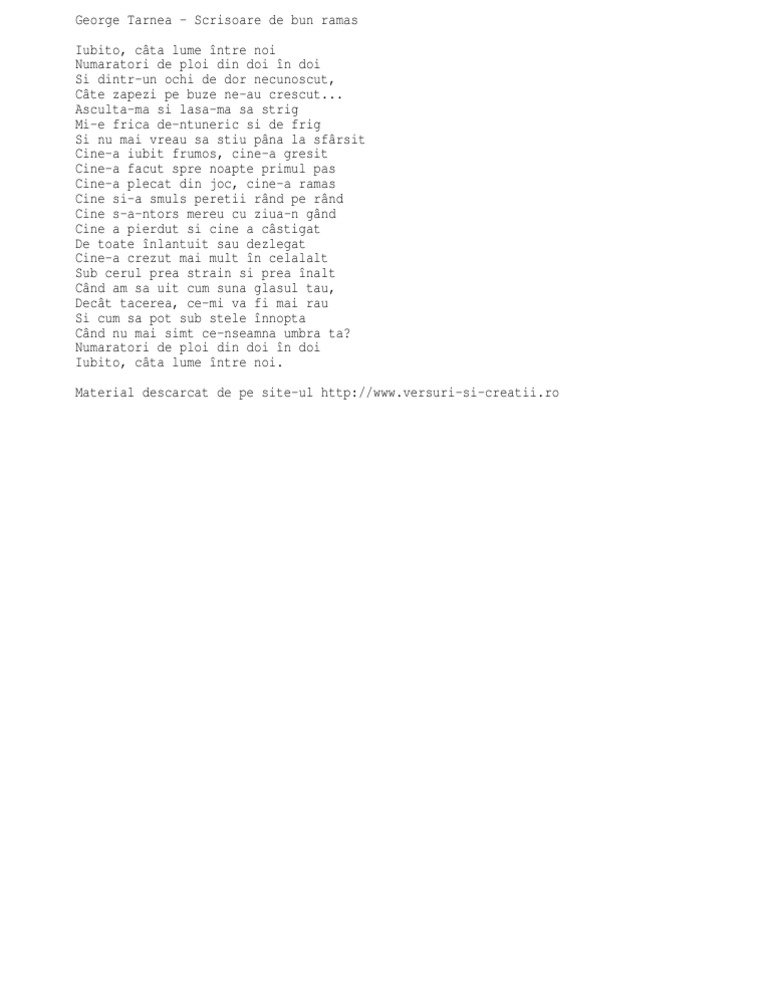 Indiferent dacă vă părăsiți locul de muncă sau scrieți o scrisoare la revedere unui coleg care se îndreaptă spre altceva veți găsi o varietate de eșantioane de scrisori și mesaje de e mail aici pentru a vă ajuta să realizați o reînnoire profesională și sinceră. Enjoy the videos and music you love upload original content and share it all with friends family and the world on youtube. Chiar daca stii ca te asteapta un viitor mai bun despartirile sunt intotdeauna dureroase mai ales ca ai investit timp uneori mai mult timp decat petreci in compania familiei sau a prietenilor ai legat relatii profesionale dar si prietenii de durata. Versuri scrisoare de bun ramas de pasărea colibri.